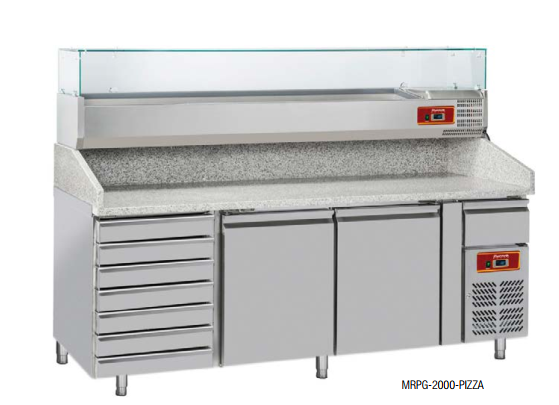 La Mesa Refrigerada Pizza con Vitrina de Ingredientes MRPG-2000 de Savemah tiene la encimera de granito blanco y sistema automático de evaporación del agua.